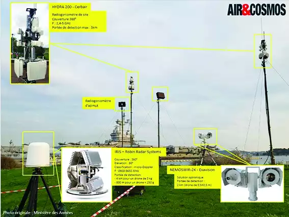 Pour la détection, CS intègrera deux radiogoniomètres de la suite Hydra de Cerbair. Capables de détecter un drone émettant dans la bande 2,4-5,8 GHz – comme les drones quadrirotor de DJI – jusqu’à 3 km, ils constitueront le premier niveau d’alerte. Le radar Iris de l’industriel néerlandais Robin Radar