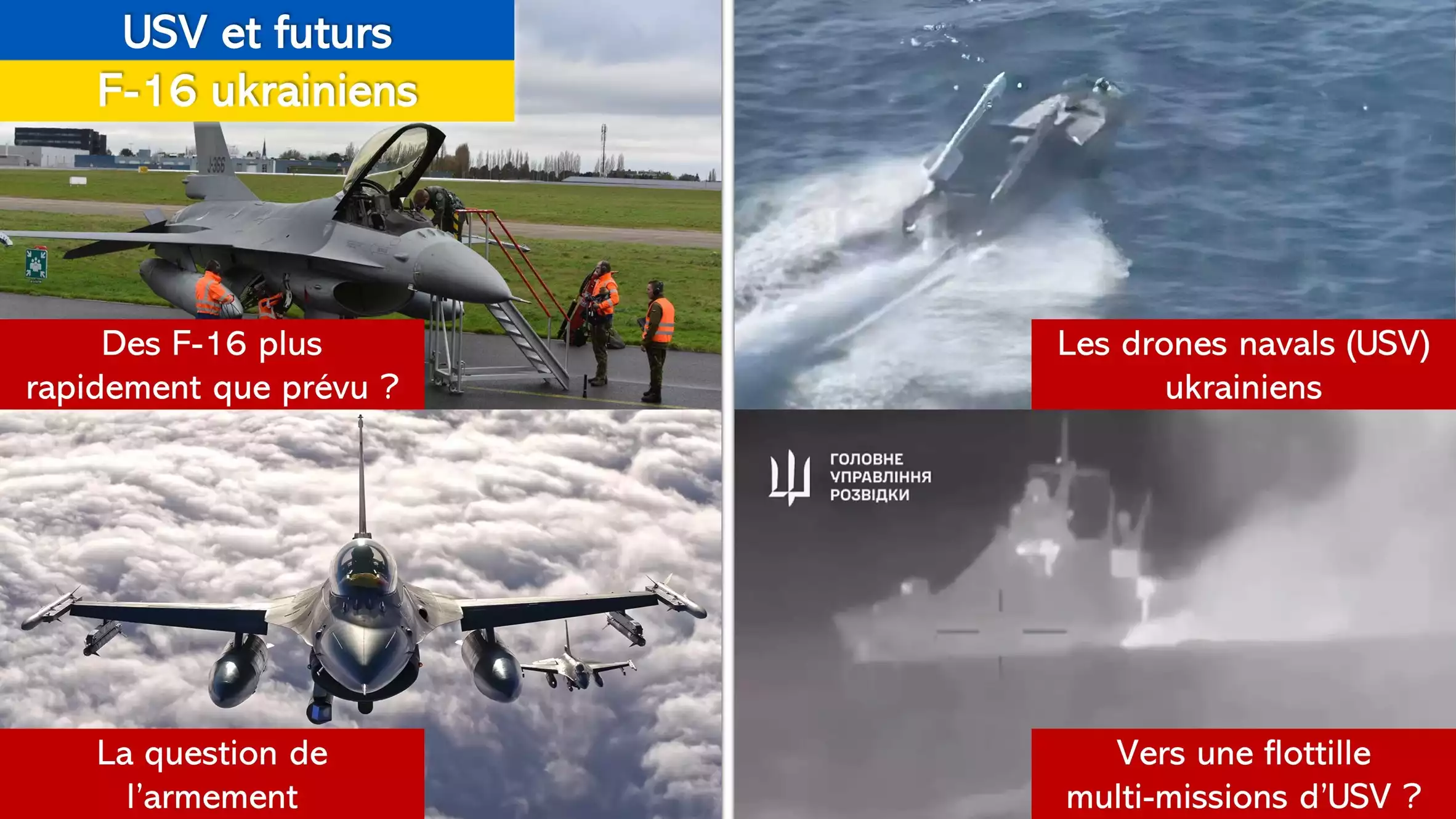 Les drones de surfaces (USV) ukrainiens se développent, avec des capacités kamikazes, de frappe à courte distance ou encore antiaériennes. Une coordination de ces USV verrait alors la création de flottilles multi-missions redoutables en mer Noire. Quant aux avions de combat F-16 Fighting Falcon, ceux-ci devraient arriver prochainement en Ukraine et représentent un véritable saut technologique pour les pilotes. Une question reste en suspens : quel armement sera fourni avec ces avions ?