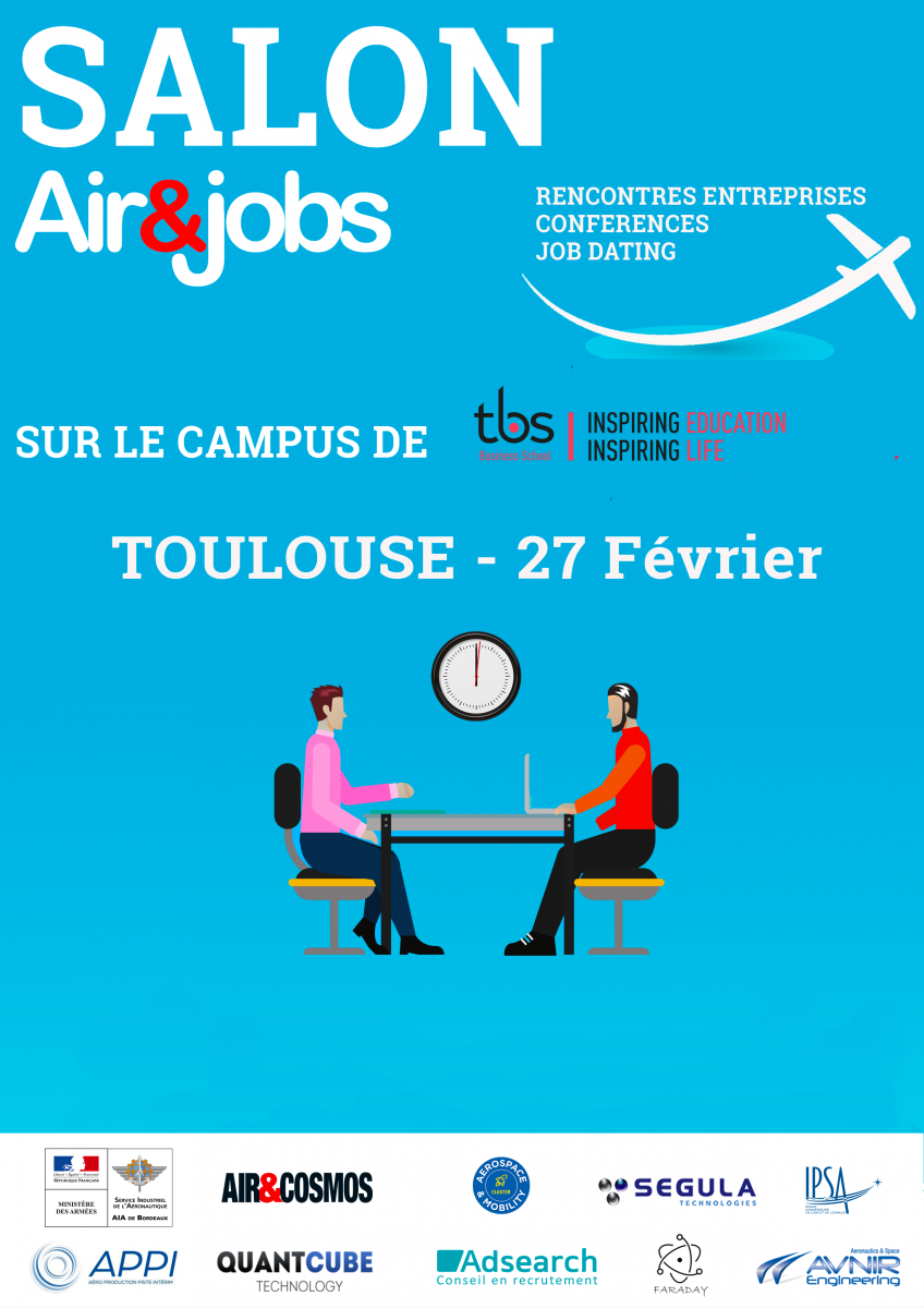 Retour en images sur le tout premier Salon Air&Jobs qui s'est déroulé le 27 Février dans les locaux de TBS Education à Toulouse ! En partenariat avec les écoles TBS Education et IPSA, école d'ingénieurs de l'air et de l'espace, notre premier salon Air&Jobs qui s’est déroulé avec un franc succès !